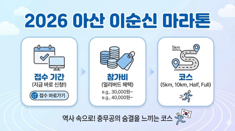 매년 4월이면 전국의 러너들이 아산으로 모여듭니다. 바로 2026 아산 성웅 이순신 마라톤 대회 때문인데요. 아름다운 은행나무길과 곡교천을 따라 달리는 코스는 초보자부터 숙련된 러너까지 모두에게 사랑받고 있습니다.